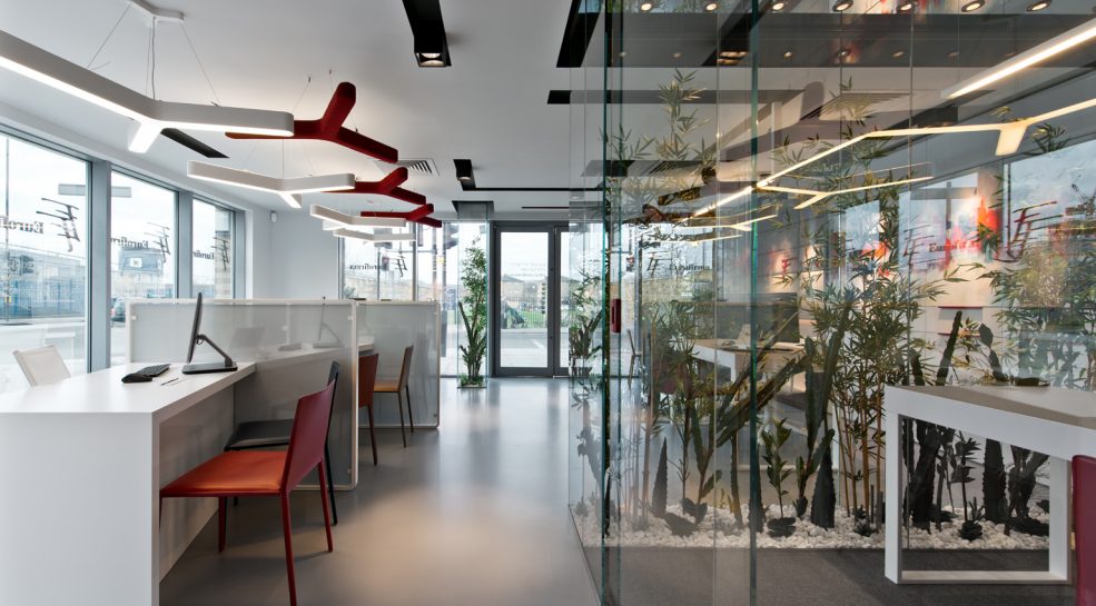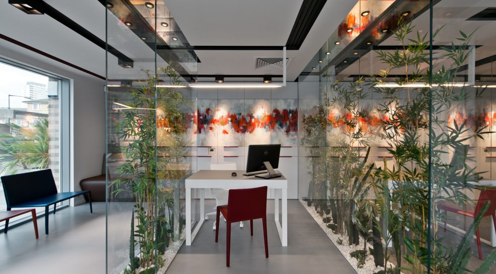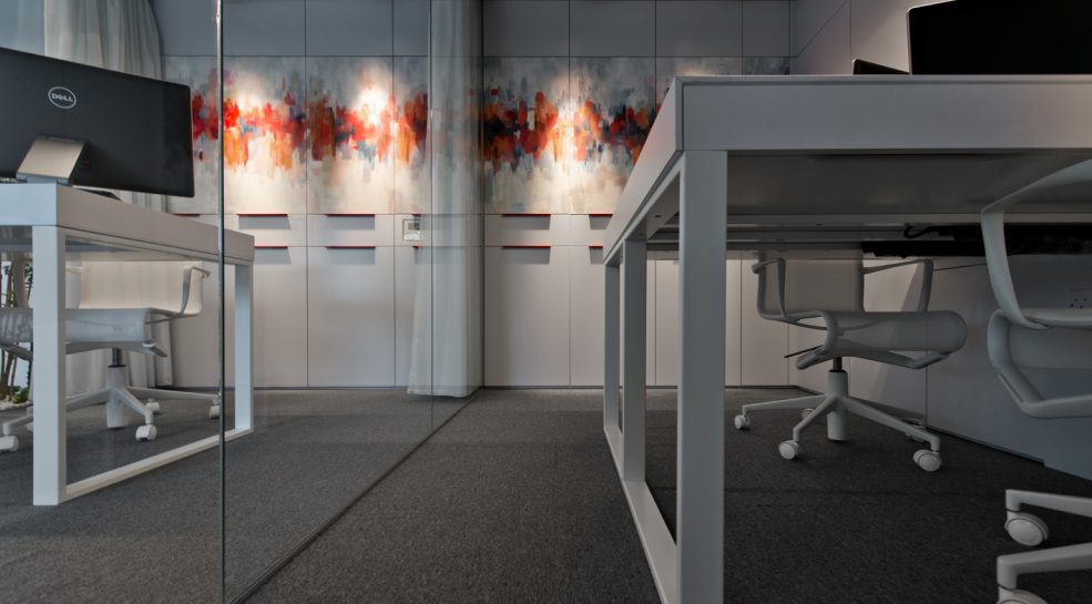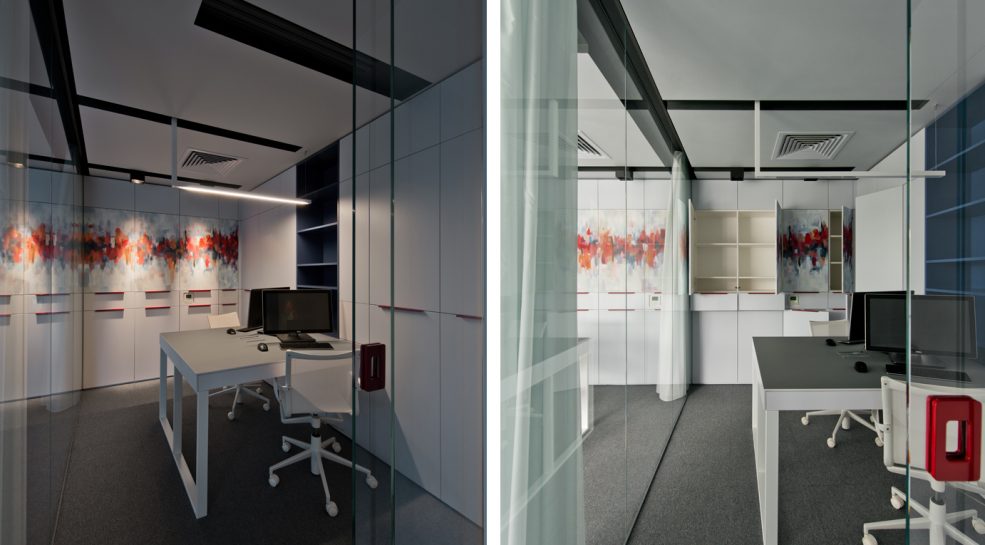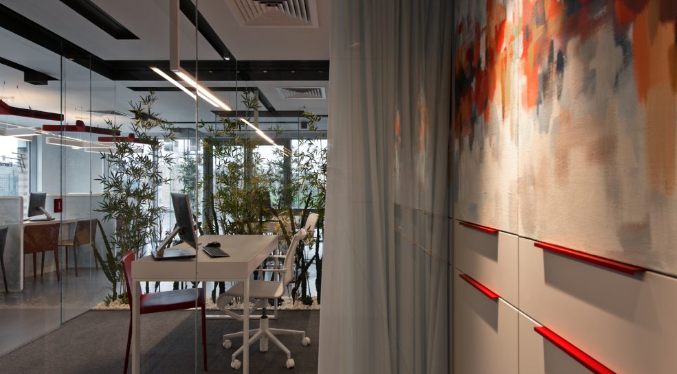 Svarbiausias uždavinys sau ir pažadas užsakovams , kuriant biuro interjerą buvo sukurti jaukią namų atmosferą šešias dienas per savaitę dirbančiam kolektyvui. Pagrindiniai interjero akcentai yra stikliniai kubai su augalais viduje ir specialiai šiam objektui sukurti korpusiniai baldai su menininko ant drobės ištapytais paveikslais, kurie funkcionuoja kaip spintų fasadai.