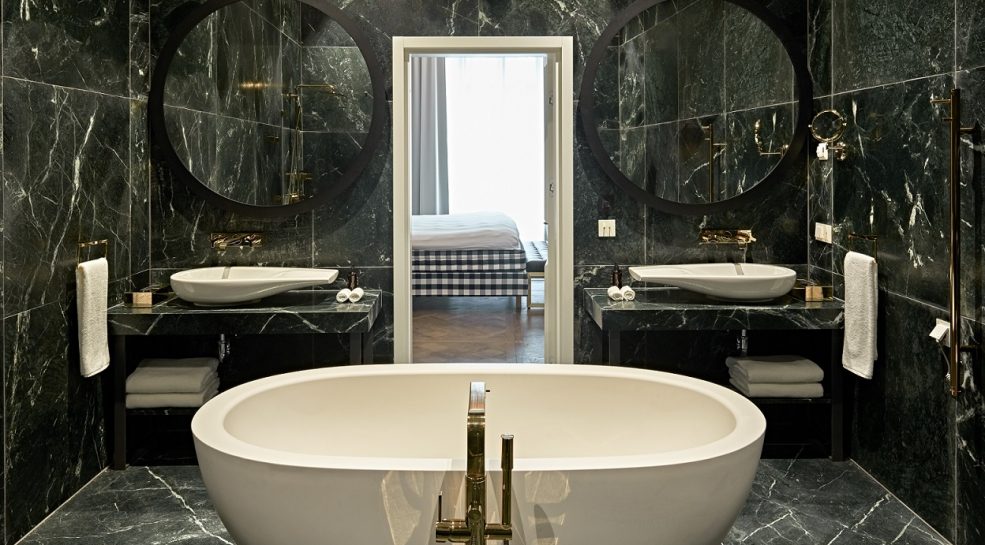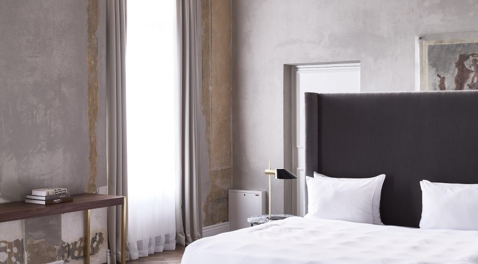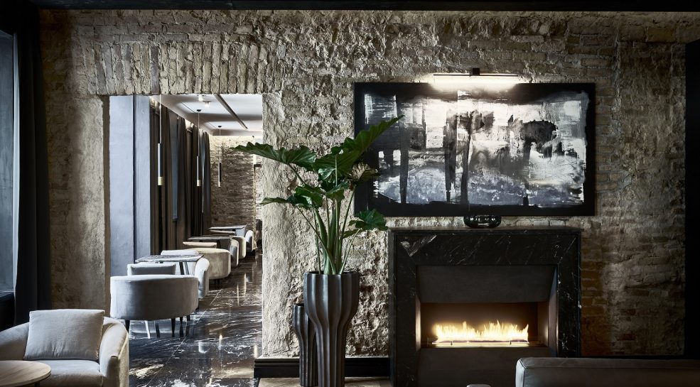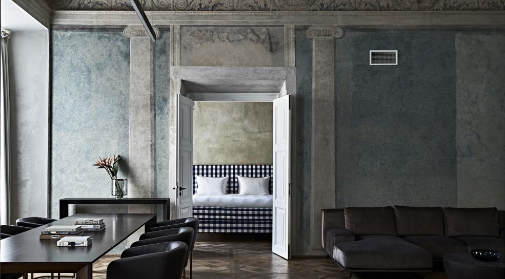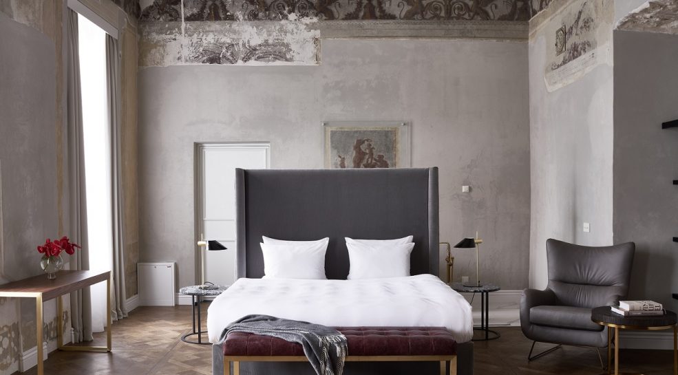 Kuriant viešbučio interjerą, projekto dizainerės siekė išsaugoti autentiškas freskas, aptrupėjusias sienas, plytas ir balkius. Papildant istorinį palikimą, buvo pasirinkti kokybiški, iš natūralių medžiagų gaminami baldai. Įmonės specialistai konsultavo interjero dizainerius renkantis medžiagas. Viešbutyje naudotos prabangios medžiagos: daug natūralios odos (ja aptraukiami lovūgaliai, lovų rėmai), gobeleno, daug marmuro. Kalbant apie viešbučio baldus, naudota labai daug žalvario. Kai kurie baldai buvo gaminami keliais etapais, medžiagos jiems siunčiamos iš įvairių pasaulio kraštų, atskiros detalės gaminamos Lietuvoje ir viskas montuojama vietoje – viešbutyje.